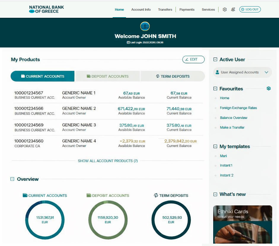 Έχετε πλήρη εικόνα των προϊόντων της επιχείρησής σας, πραγματοποιείτε μεταφορές και εμβάσματα, πληρώνετε λογαριασμούς, εξατομικεύετε την αρχική οθόνη σύμφωνα με τις ανάγκες σας και διαχειρίζεστε όλες τις εγκρίσεις, online, από το κινητό σας.